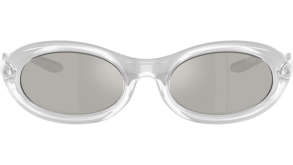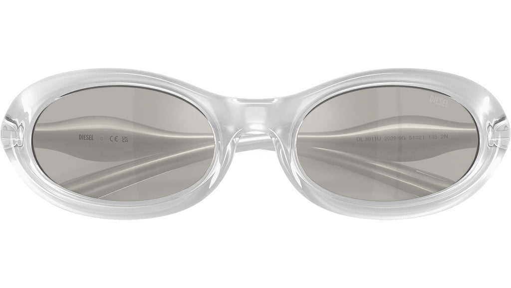 Occhiali da sole Diesel DL3011U 20296G unisex con montatura ovale in iniettato trasparente metallico e lenti in bio poliammide color grigio chiaro specchiato argento. Vestibilità a ponte alto. Linea: Fashion Show. Codice modello: 0DL3011U. Codice colore: 20296G. Made in Italy. Rivenditore autorizzato Diesel online. Gli occhiali vengono consegnati con custodia e accessori originali e sono coperti dalla garanzia ufficiale di 12 mesi del produttore.