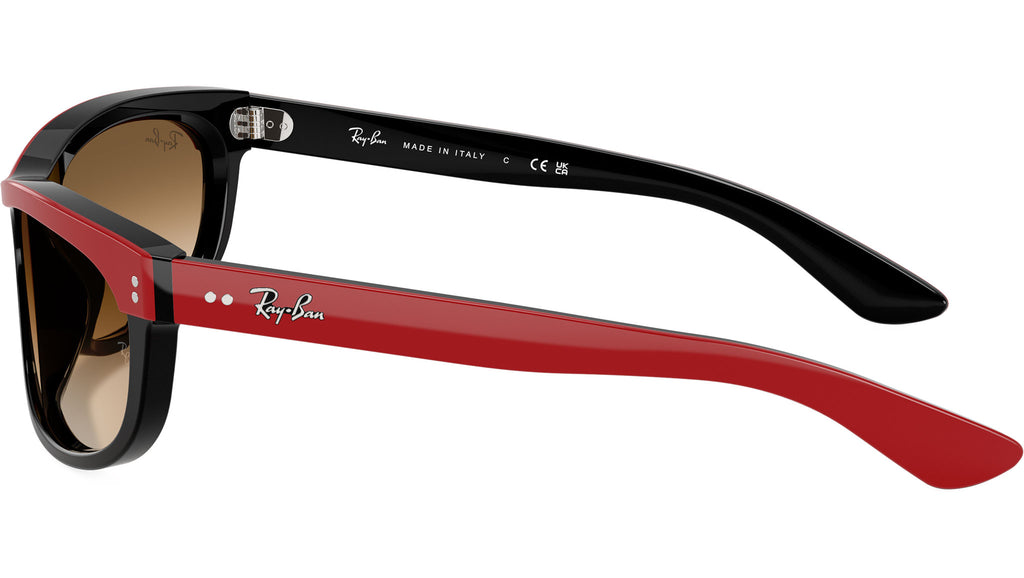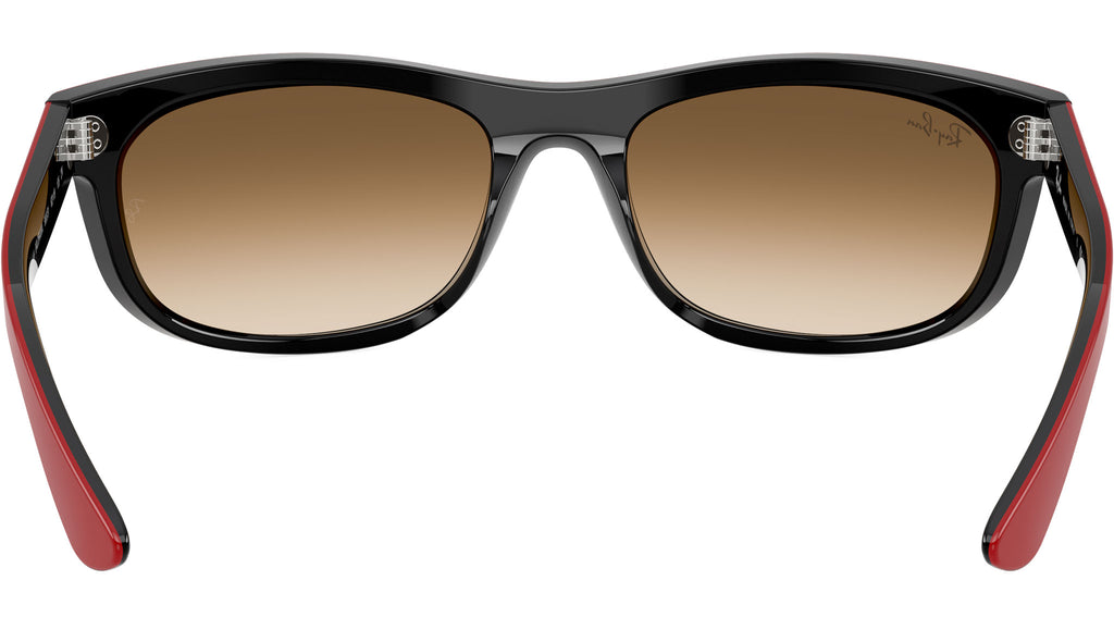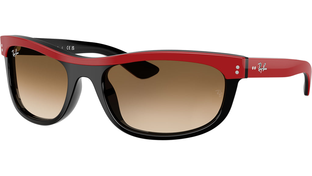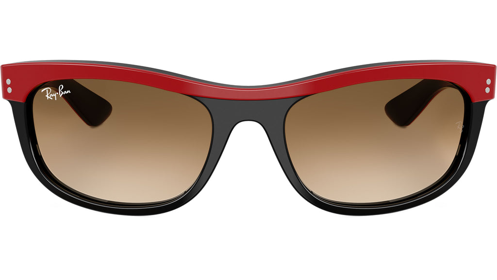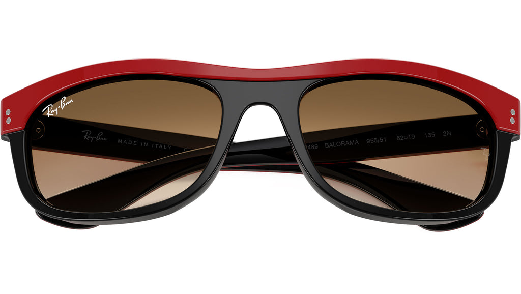 Occhiali da sole Ray-Ban Balorama RB2489 955/51 unisex con montatura rettangolare in acetato rosso su nero e lenti in cristallo color marrone chiaro sfumato. Vestibilità a ponte alto. Linea: Evolution. Codice modello: 0RB2489. Codice colore: 955/51. Rivenditore autorizzato Ray-Ban online. Gli occhiali vengono consegnati con custodia e accessori originali e sono coperti dalla garanzia ufficiale di 12 mesi del produttore.