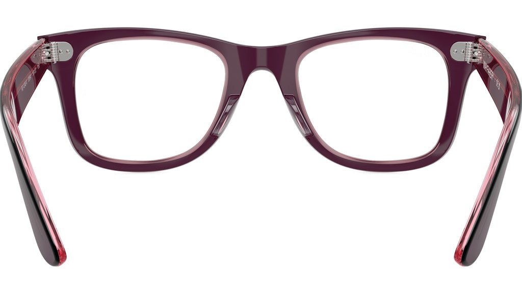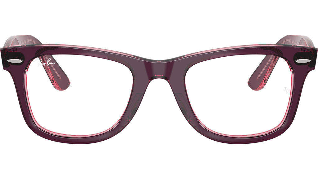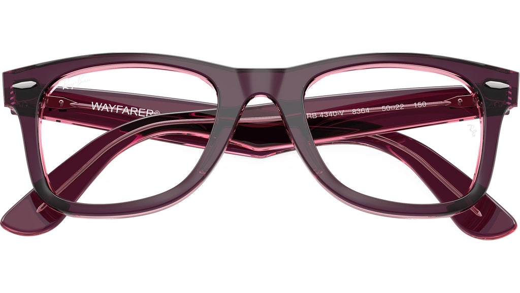 Occhiali da vista Ray-Ban Wayfarer Ease RB4340V 8364 unisex con montatura squadrata in propionato viola su rosa trasparente e lenti demo. Vestibilità a ponte alto. Linea: Legacy. Codice modello: 0RX4340V. Codice colore: 8364. Rivenditore autorizzato Ray-Ban online. Gli occhiali vengono consegnati con custodia e accessori originali e sono coperti dalla garanzia ufficiale di 12 mesi del produttore.