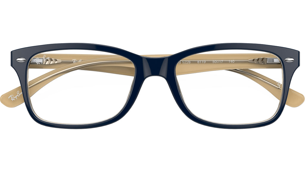Occhiali da vista Ray-Ban RB5228 Optics RB5228 8119 unisex con montatura squadrata in acetato blu su marrone chiaro trasparente e lenti demo. Linea: Highstreet. Codice modello: 0RX5228. Codice colore: 8119. Rivenditore autorizzato Ray-Ban online. Gli occhiali vengono consegnati con custodia e accessori originali e sono coperti dalla garanzia ufficiale di 12 mesi del produttore.
