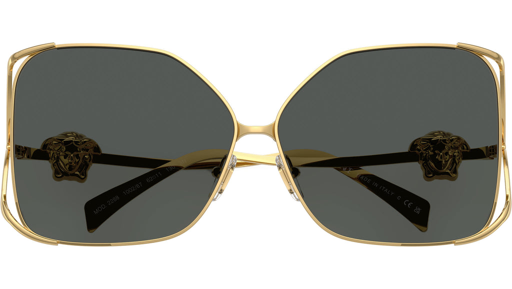 Occhiali da sole Versace donna modello VE2288 100287 con montatura squadrata in acciaio oro e lenti base 4 in policarbonato grigio scuro. Naselli regolabili. Linea: Fashion Id. Codice Brand: 0VE2288. Codice colore: 100287. Rivenditore autorizzato online Versace Eyewear. Ogni prodotto Versace viene consegnato con astuccio originale e accessori ed è coperto da garanzia del produttore di 12 mesi.