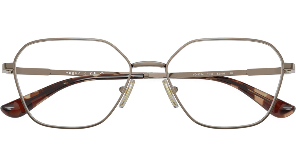 Montatura per occhiali da vista Vogue donna modello VO4334 5138 con montatura geometrica in metallo marrone chiaro e lenti demo base 4. Naselli regolabili. Linea: In Vogue. Codice Brand: 0VO4334. Codice colore: 5138. Rivenditore autorizzato online Vogue Eyewear. Ogni prodotto Vogue viene consegnato con astuccio originale e accessori ed è coperto da garanzia del produttore di 12 mesi.