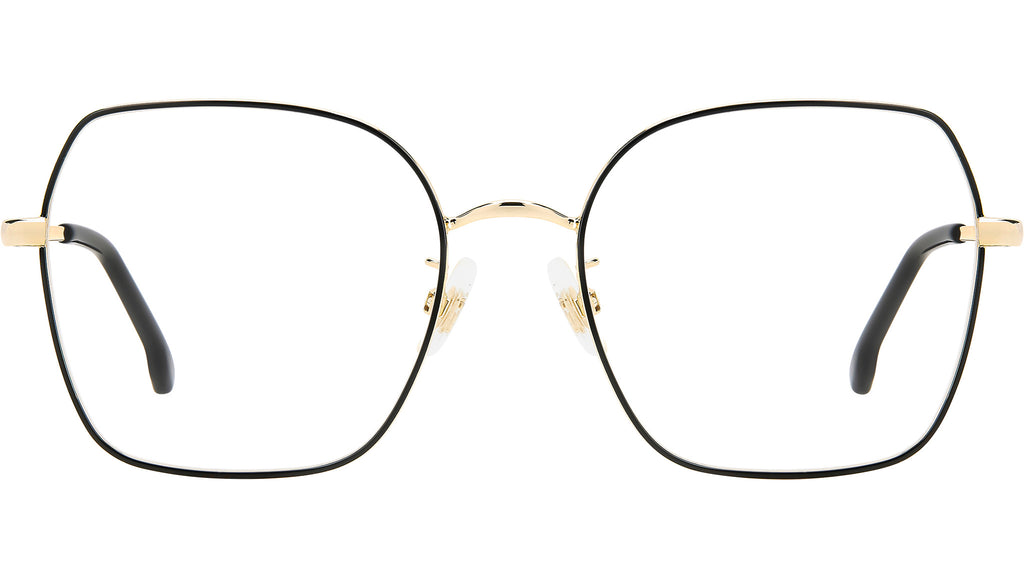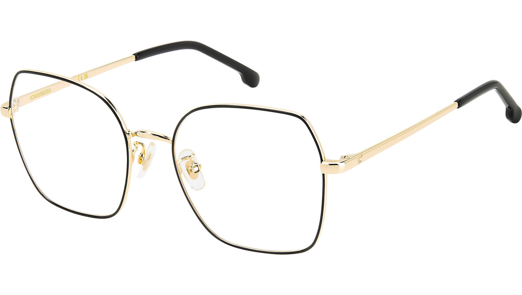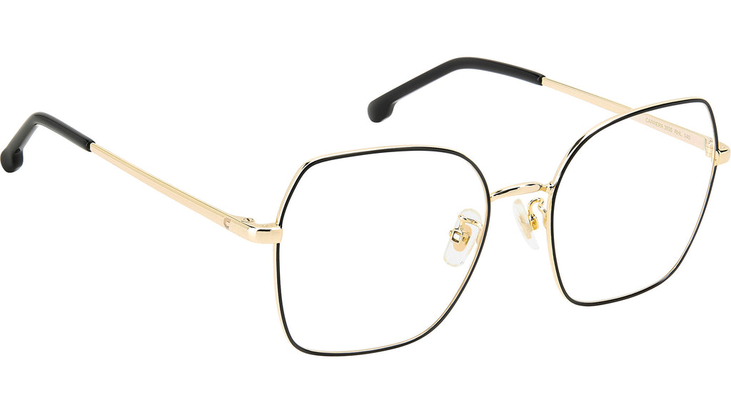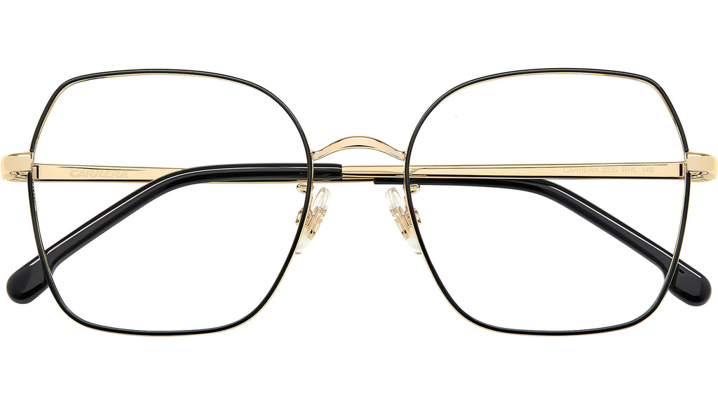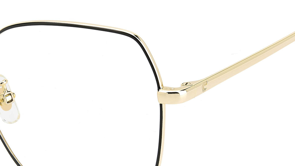 Occhiali da vista Carrera 3035 RHL donna con montatura quadrata in metallo oro nero e lenti demo. Carrera propone occhiali da vista dedicati alla donna di oggi e di domani. Una versione rivisitata di una montatura classica, sottile e leggera in acciaio inossidabile, ancora più notevole nelle versioni con il profilo del frontale smaltato. Anche le aste sono snelle, firmate dalla “C” simbolo di Carrera incisa a laser. Terminali in acetato e naselli regolabili offrono una calzata comoda e stabile. Linea: Signature. Codice modello: 108188. Codice colore: RHL. Rivenditore autorizzato Carrera online. Gli occhiali vengono consegnati con custodia e accessori originali e sono coperti dalla garanzia ufficiale di 12 mesi del produttore.