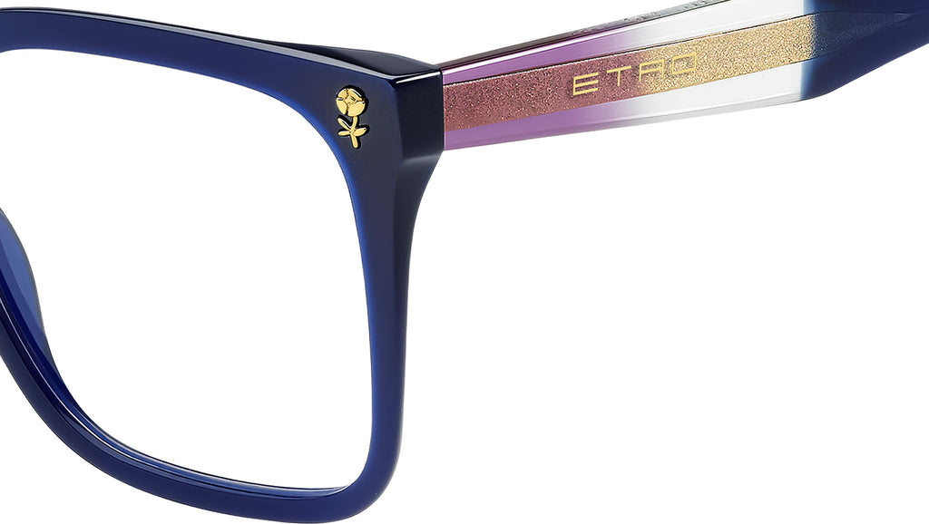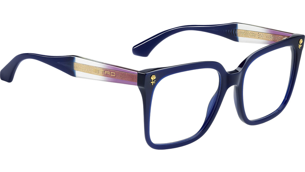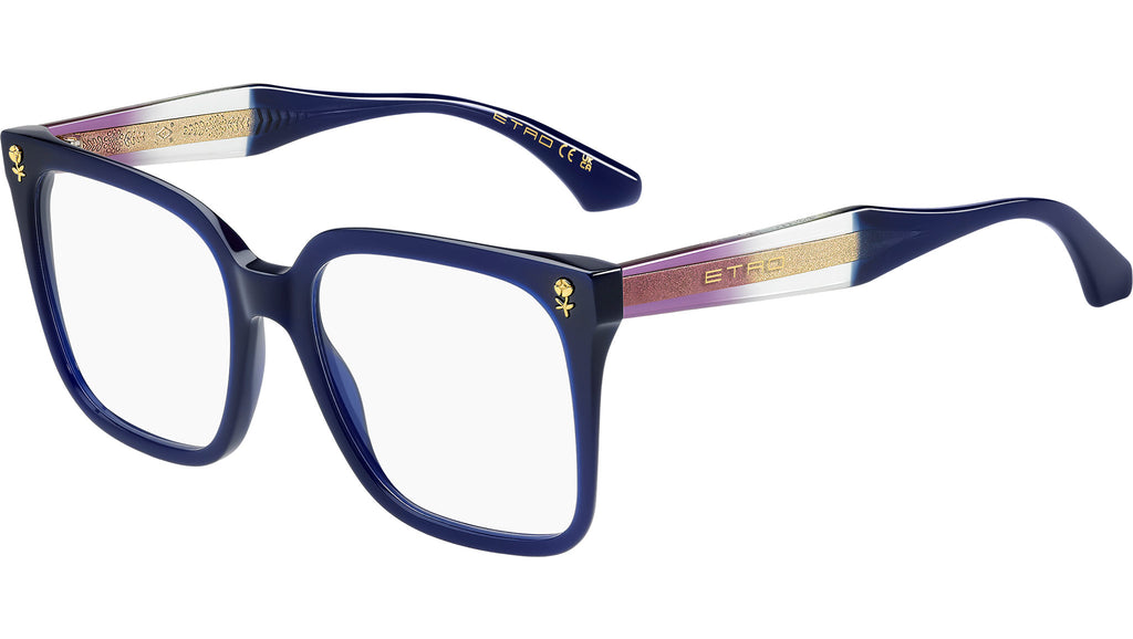 Occhiali da vista Etro 0093 PJP donna con montatura squadrata in acetato blu e lenti demo. La collezione eyewear 'Colour Stripes' di ETRO esprime l'anima del brand con occhiali da vista che non passano inosservati. Il frontale in acetato, lavorato con linee moderne e proporzioni equilibrate, è abbinato ad aste geometriche impreziosite da un filo metallico sottile. Dettagli floreali, ispirati all'arte del ricamo, e il logo dorato di ETRO aggiungono un tocco sofisticato. Disponibili in un'ampia gamma di colori, le tonalità piene e il design accattivante delle aste esaltano l’unicità del modello. Linea: Etromania. Codice modello: 109297. Codice colore: PJP. Rivenditore autorizzato Etro online. Gli occhiali vengono consegnati con custodia e accessori originali e sono coperti dalla garanzia ufficiale di 12 mesi del produttore.