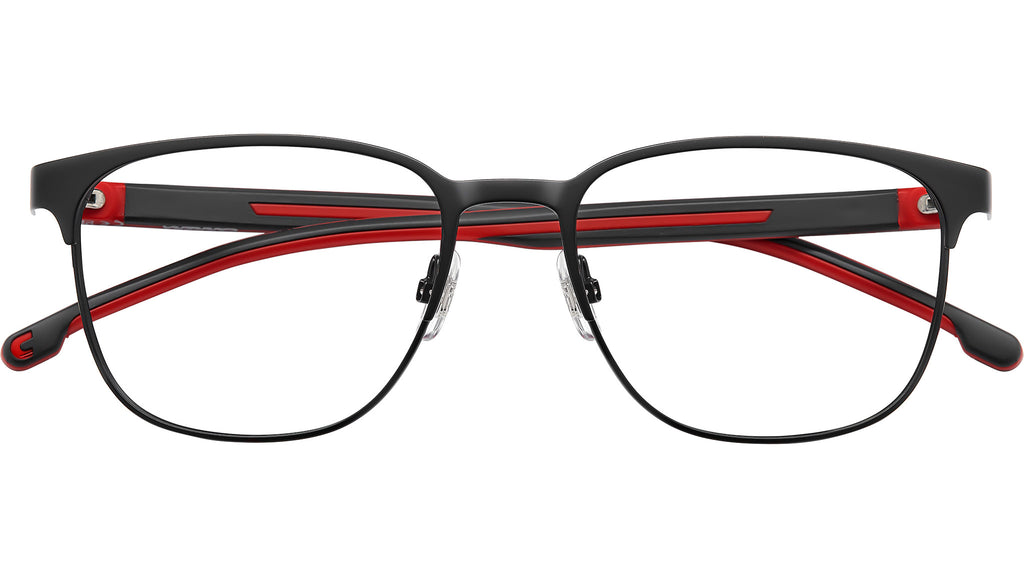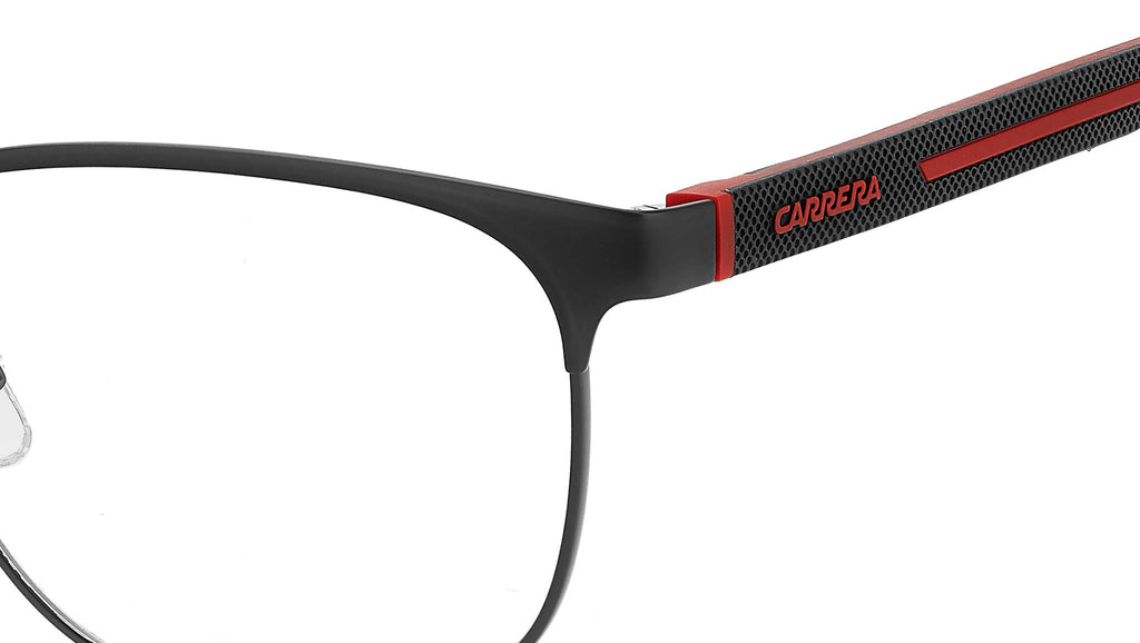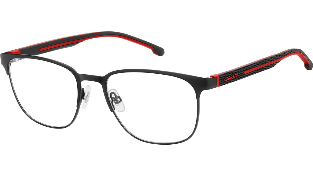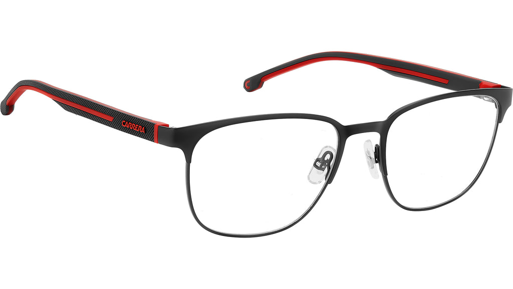 Occhiali da vista Carrera 8917 BLX uomo con montatura rettangolare in metallo nero opaco rosso e lenti demo. Occhiali da vista Carrera di ispirazione activewear, perfetti per sentirsi sempre on the move. Cosa li rende speciali? Sicuramente le aste bi-iniettate dalla superficie texturizzata, con logo Carrera in rilievo e inserti gommati. Da scegliere in versione monocromatica, per un look più minimale, oppure con colore a contrasto per una nota decisa. Il frontale è in acciaio inossidabile, con naselli da regolare sul naso assecondando la propria fisionomia. Linea: Sport. Codice modello: 109494. Codice colore: BLX. Rivenditore autorizzato Carrera online. Gli occhiali vengono consegnati con custodia e accessori originali e sono coperti dalla garanzia ufficiale di 12 mesi del produttore.