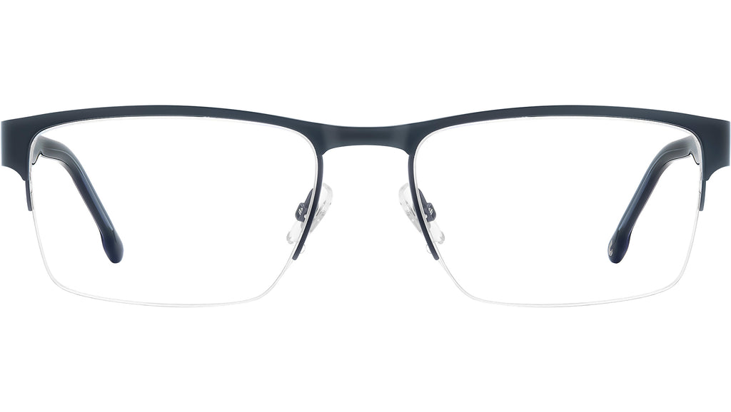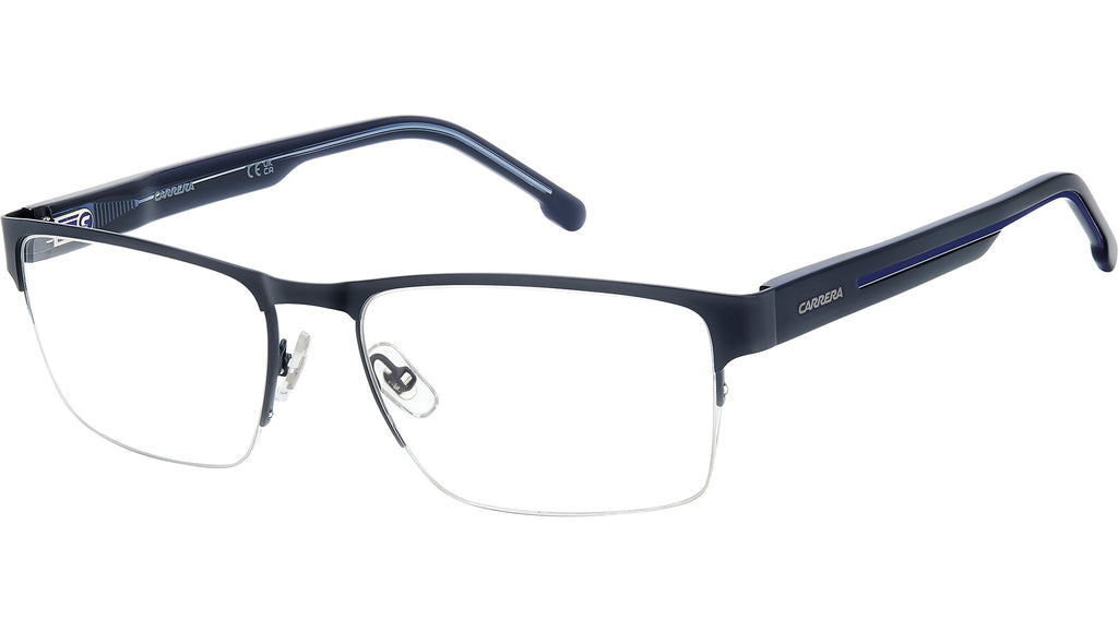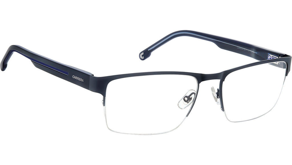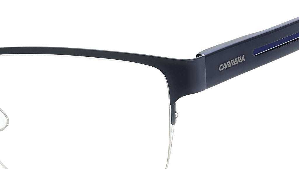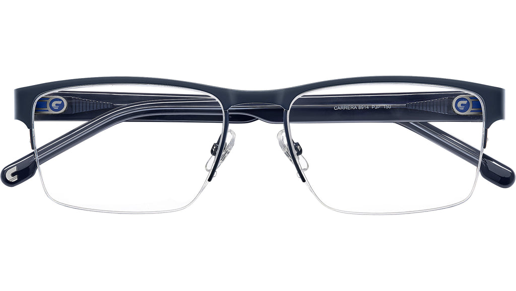 Occhiali da vista Carrera 8914 PJP uomo con montatura rettangolare in metallo blu e lenti demo. Carrera prende molto sul serio il comfort e la versatilità: il risultato è questo occhiale da vista con frontale a mezza montatura. La vestibilità è personalizzata grazie a naselli regolabili, cerniere flessibili e la possibilità di scegliere tra due diversi calibri. Lo stile è definito dalle nuove aste in acetato, scolpite a mimare la flag Carrera. Da scegliere tono su tono, blu, oppure in rosso - colore simbolo Carrera. Linea: Sport. Codice modello: 109536. Codice colore: PJP. Rivenditore autorizzato Carrera online. Gli occhiali vengono consegnati con custodia e accessori originali e sono coperti dalla garanzia ufficiale di 12 mesi del produttore.