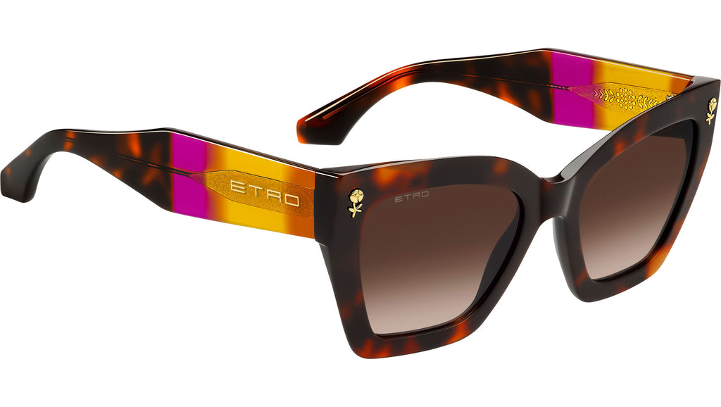 Occhiali da sole Etro 0090/S 086 HA donna con montatura rettangolare in acetato avana e lenti in CR-39 marrone sfumato. Un passo avanti nella storia delle 'Colour Stripes' di ETRO, questi occhiali da sole sono pensati per farsi notare. Il frontale in acetato, smussato per garantire leggerezza, si unisce ad aste geometriche in una palette ombré trasparente, che mette in evidenza il filo metallico grafico. I dettagli floreali, ispirati alle tecniche di ricamo più intricate, il celebre logo ETRO e i terminali iconici completano ogni modello. La palette di colori unisce tonalità classiche e trasparenze intriganti, per un effetto visivo sorprendente. Linea: Etromania. Codice modello: 207784. Codice colore: 086 HA. Rivenditore autorizzato Etro online. Gli occhiali vengono consegnati con custodia e accessori originali e sono coperti dalla garanzia ufficiale di 12 mesi del produttore.