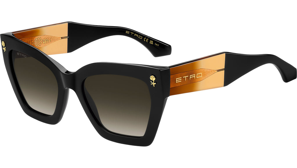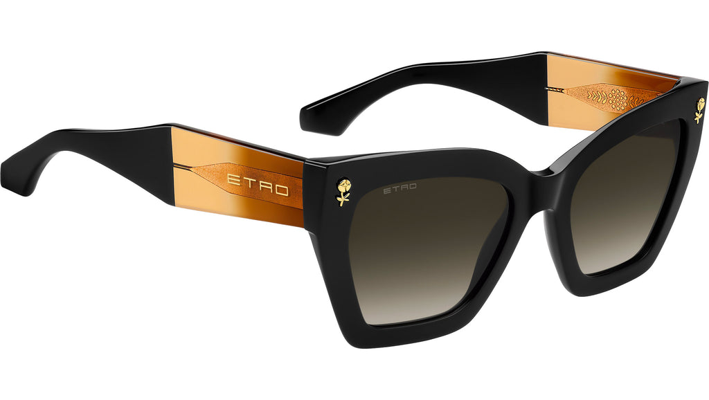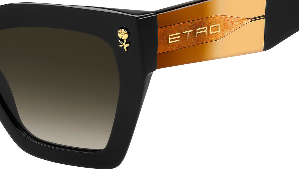 Occhiali da sole Etro 0090/S 807 HA donna con montatura rettangolare in acetato nero e lenti in CR-39 marrone sfumato. Un passo avanti nella storia delle 'Colour Stripes' di ETRO, questi occhiali da sole sono pensati per farsi notare. Il frontale in acetato, smussato per garantire leggerezza, si unisce ad aste geometriche in una palette ombré trasparente, che mette in evidenza il filo metallico grafico. I dettagli floreali, ispirati alle tecniche di ricamo più intricate, il celebre logo ETRO e i terminali iconici completano ogni modello. La palette di colori unisce tonalità classiche e trasparenze intriganti, per un effetto visivo sorprendente. Linea: Etromania. Codice modello: 207784. Codice colore: 807 HA. Rivenditore autorizzato Etro online. Gli occhiali vengono consegnati con custodia e accessori originali e sono coperti dalla garanzia ufficiale di 12 mesi del produttore.