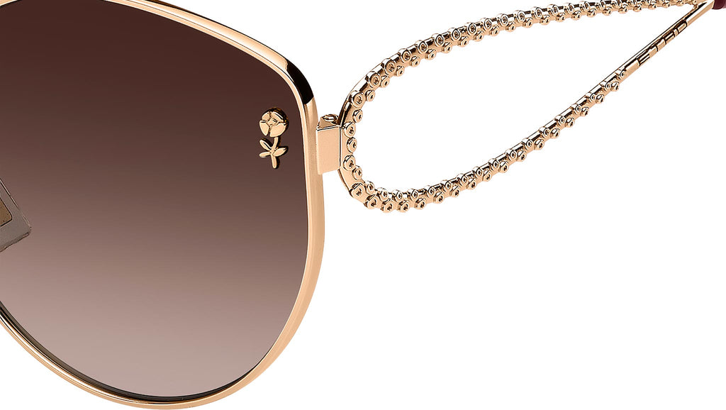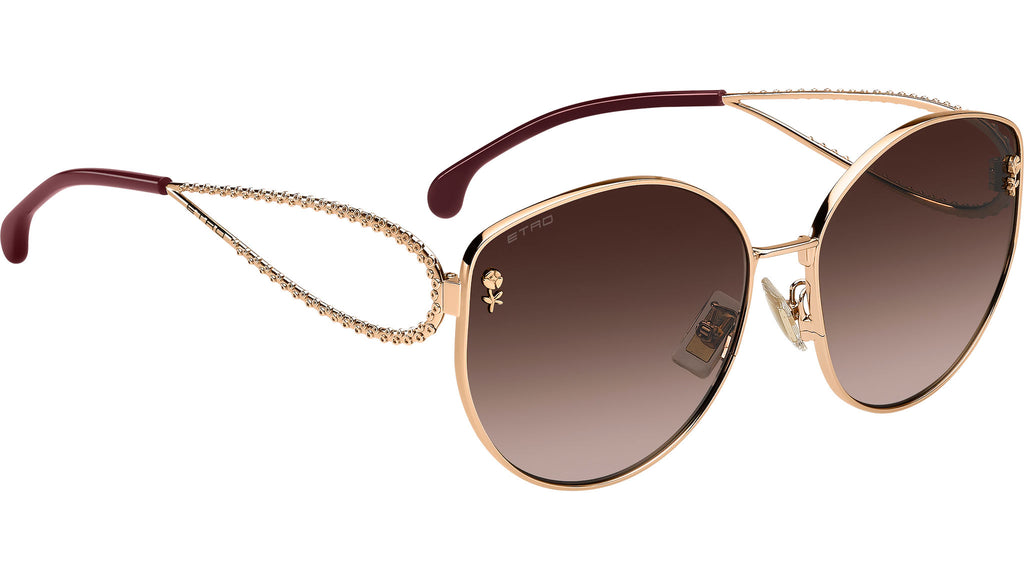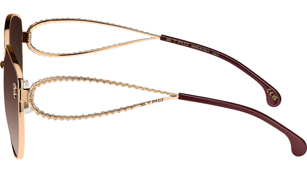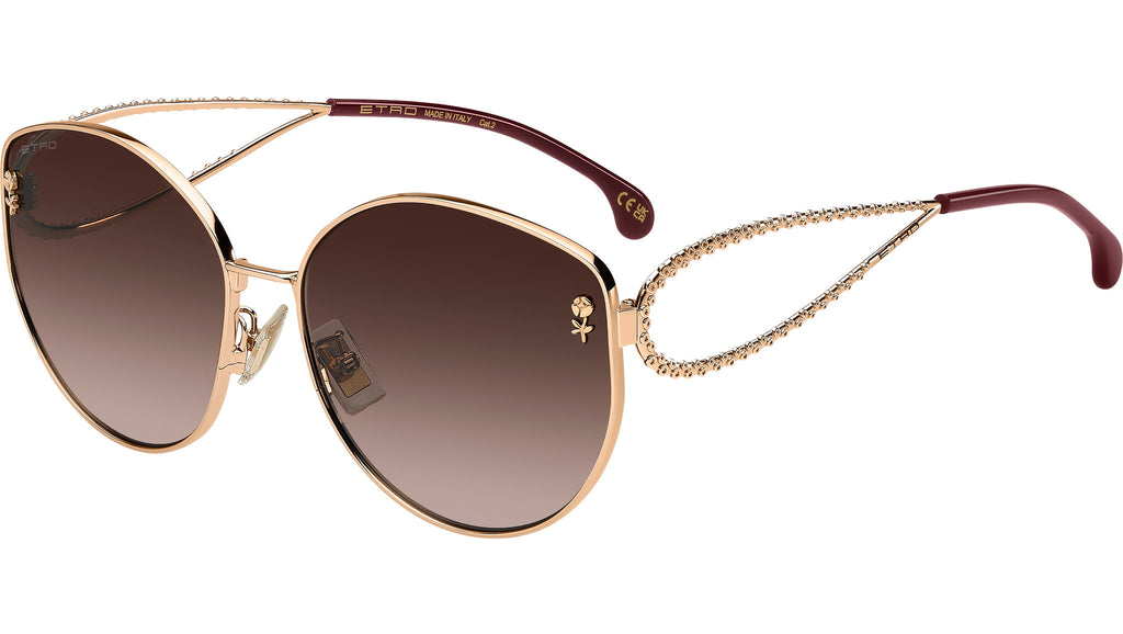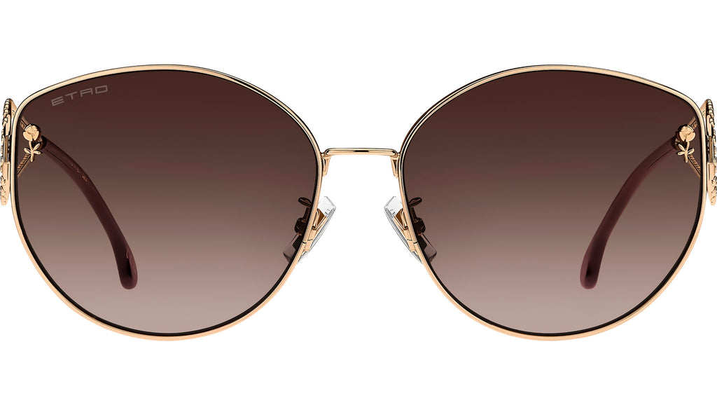 Occhiali da sole Etro 0072/F/S DDB HA donna con montatura cat eye in metallo oro rame e lenti in CR-39 marrone sfumato. Un omaggio alla creatività e all'arte, questi occhiali da sole ETRO prendono ispirazione dalla collezione di gioielli del brand. La silhouette in metallo, leggera ed essenziale, è arricchita da aste scultoree lavorate con una tecnica di cesellatura innovativa che dona un effetto tridimensionale. Il motivo Paisley, reinterpretato nelle aste arrotondate, assicura un comfort quotidiano, mentre i dettagli floreali e il logo brillante completano un design che unisce raffinatezza e funzionalità. Linea: Etromania. Codice modello: 207872. Codice colore: DDB HA. Rivenditore autorizzato Etro online. Gli occhiali vengono consegnati con custodia e accessori originali e sono coperti dalla garanzia ufficiale di 12 mesi del produttore.