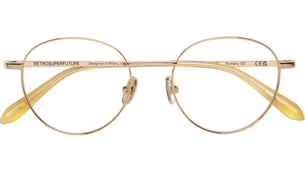 Montatura per occhiali da vista Retrosuperfuture Numero 137 Cremoso con montatura in metallo crema e lenti demo. Codice modello: 9FB. Made in Italy. Rivenditore autorizzato RSF online. Gli occhiali vengono consegnati con custodia e accessori originali e sono coperti dalla garanzia ufficiale di 12 mesi del produttore.