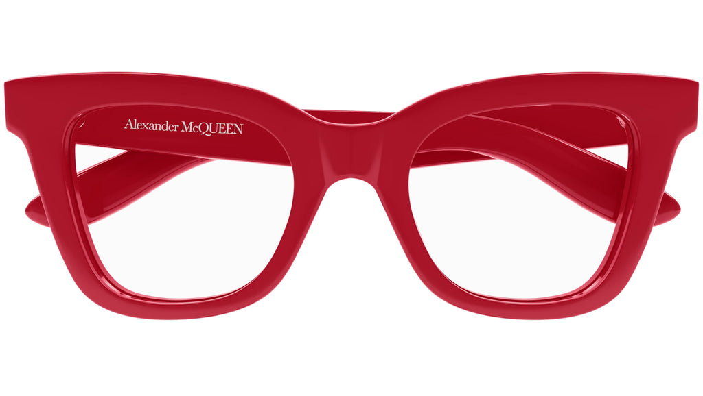 Occhiali da vista Alexander McQueen linea Casual Lines modello AM0394O variante colore 003 rosso tinta unita lucido con astine color rosso.