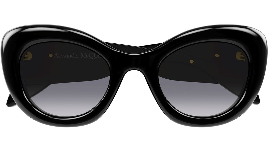 Occhiali da sole Alexander McQueen linea Icons modello AM0403S variante colore 001 nero lucido con lenti color grigio sfumato.