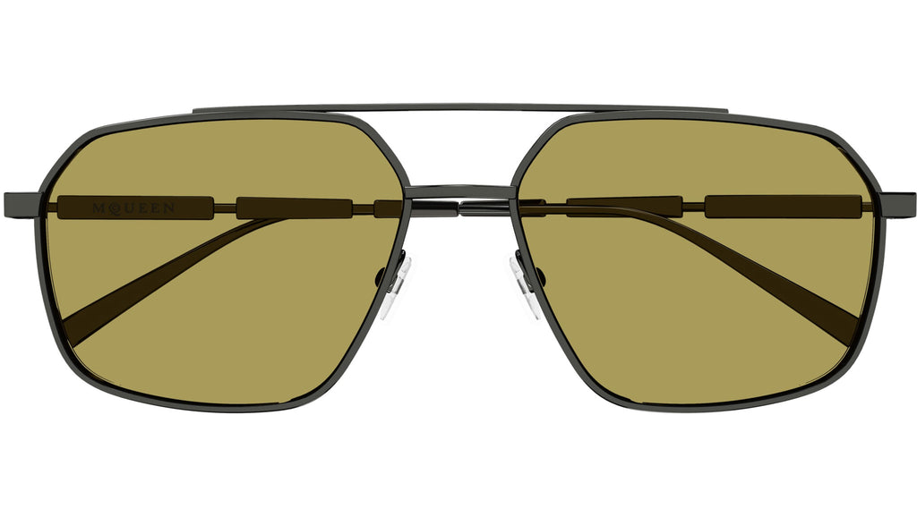 Occhiali da sole Alexander McQueen Casual Lines modello AM0477S in metallo aviatore, codice colore 003 rutenio scuro lucido con aste rutenio e lenti color verde kaki tinta unita. Rivenditore autorizzato Alexander McQueen online. Gli occhiali vengono consegnati con custodia e accessori originali e sono coperti dalla garanzia ufficiale di 12 mesi del produttore.