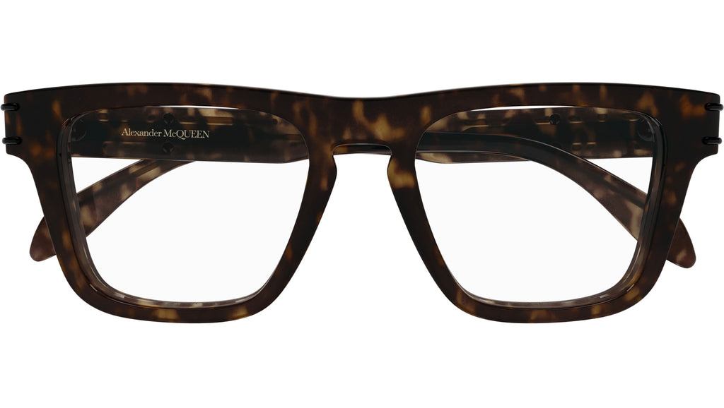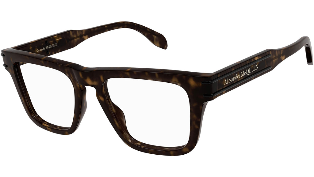 Occhiali da vista Alexander McQueen linea Casual Lines modello AM0400O variante colore 002 tartaruga scuro lucido con astine color tartaruga.