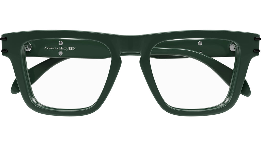 Occhiali da vista Alexander McQueen linea Casual Lines modello AM0400O variante colore 004 verde scuro tinta unita lucido con astine color verde.
