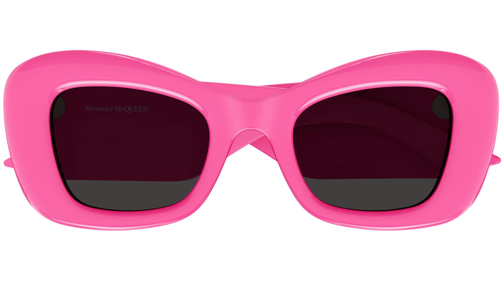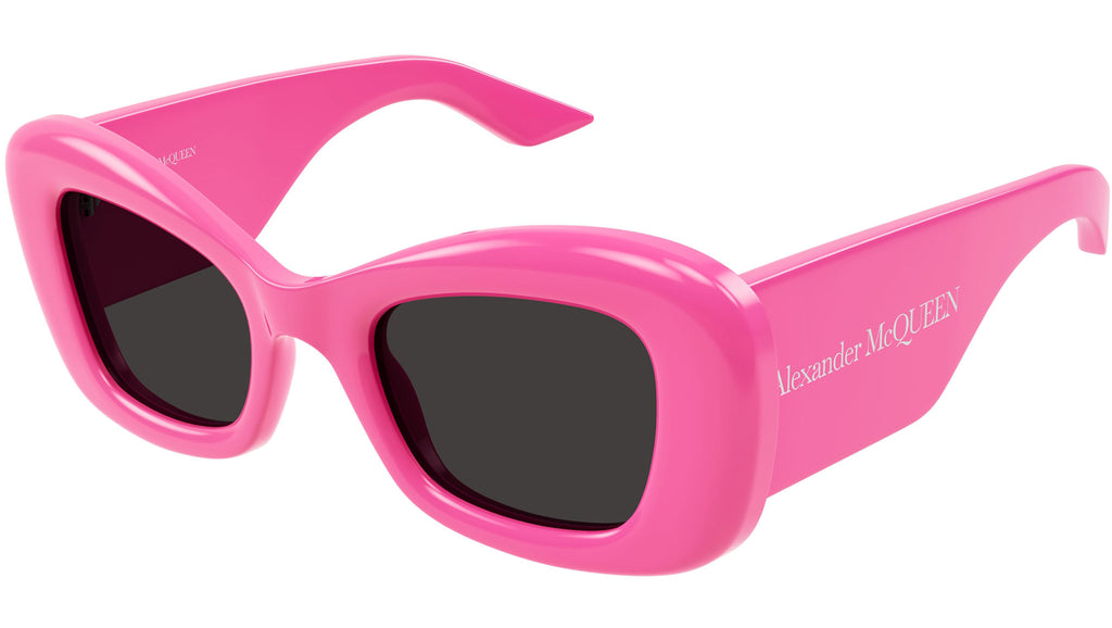 Occhiali da sole Alexander McQueen Casual Lines modello AM0434S cat eye in acetato riciclato codice colore 004 rosa fluo solido lucido con aste rosa e lenti color grigio tinta unita.