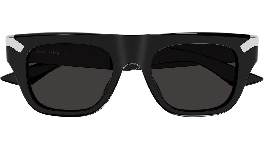 Occhiali da sole Alexander McQueen Icons modello AM0441S rectangle in acetato riciclato codice colore 001 nero lucido tinta unita con aste nero e lenti color grigio tinta unita.