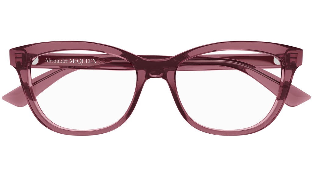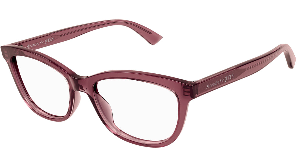Occhiali da vista Alexander McQueen Casual Lines modello AM0461O cat eye in acetato riciclato codice colore 004 borgogna trasparente lucido con aste rosso borgogna e lenti demo.