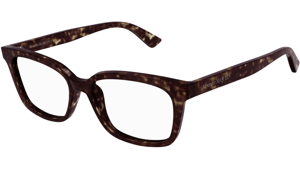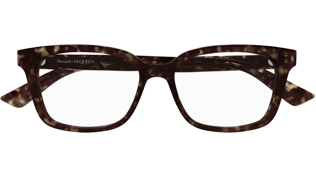 Occhiali da vista Alexander McQueen Casual Lines modello AM0464O rectangle in acetato riciclato codice colore 002 tartaruga scuro lucido con aste tartaruga e lenti demo.