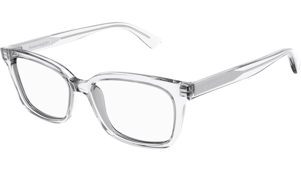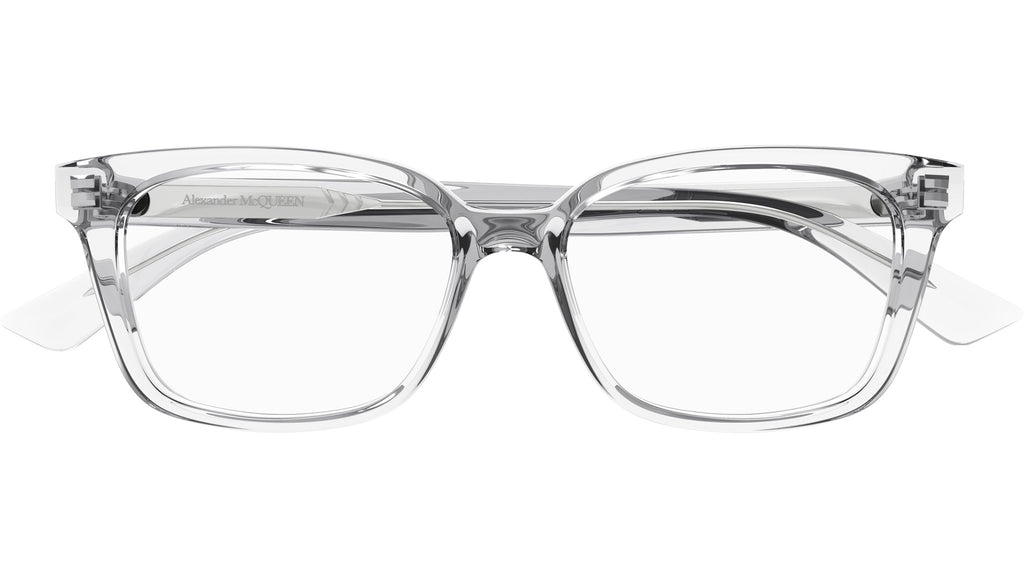 Occhiali da vista Alexander McQueen Casual Lines modello AM0464O rectangle in acetato riciclato codice colore 004 cristallo lucido con aste cristallo trasparente e lenti demo.