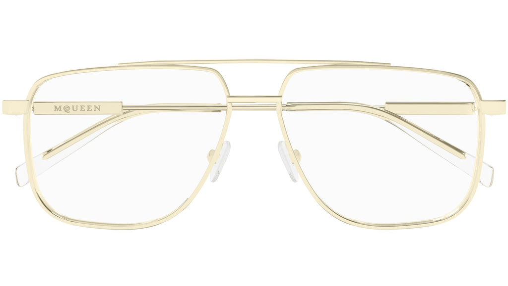Occhiali da vista Alexander McQueen Casual Lines modello AM0480O in metallo aviatore codice colore 002 oro chiaro lucido con aste oro e lenti demo. Rivenditore autorizzato Alexander McQueen online. Gli occhiali vengono consegnati con custodia e accessori originali e sono coperti dalla garanzia ufficiale di 12 mesi del produttore.