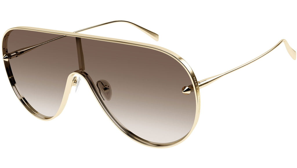 Occhiali da sole Alexander McQueen Icons modello AM0481S in metallo aviatore, codice colore 002 oro chiaro lucido con aste oro e lenti color marrone medio sfumato. Rivenditore autorizzato Alexander McQueen online. Gli occhiali vengono consegnati con custodia e accessori originali e sono coperti dalla garanzia ufficiale di 12 mesi del produttore.