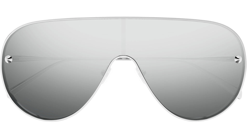 Occhiali da sole Alexander McQueen Icons modello AM0481S in metallo aviatore, codice colore 004 argento lucido con aste argento e lenti color grigio solido con mask argento a specchio. Rivenditore autorizzato Alexander McQueen online. Gli occhiali vengono consegnati con custodia e accessori originali e sono coperti dalla garanzia ufficiale di 12 mesi del produttore.