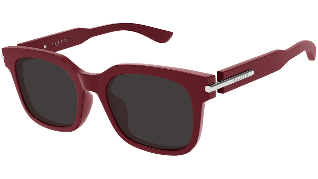 Occhiali da sole Alexander McQueen T-Bar modello AM0496SA in acetato riciclato rettangolari codice colore 003 bordeaux tinta unita lucido con aste bordeaux e lenti color grigio tinta unita. Rivenditore autorizzato Alexander McQueen online. Gli occhiali vengono consegnati con custodia e accessori originali e sono coperti dalla garanzia ufficiale di 12 mesi del produttore.