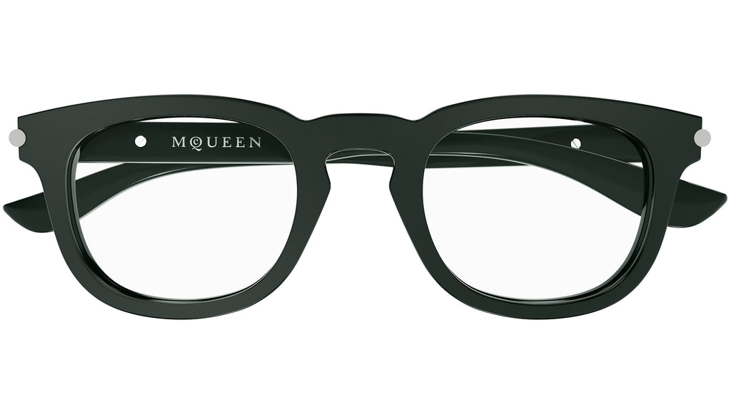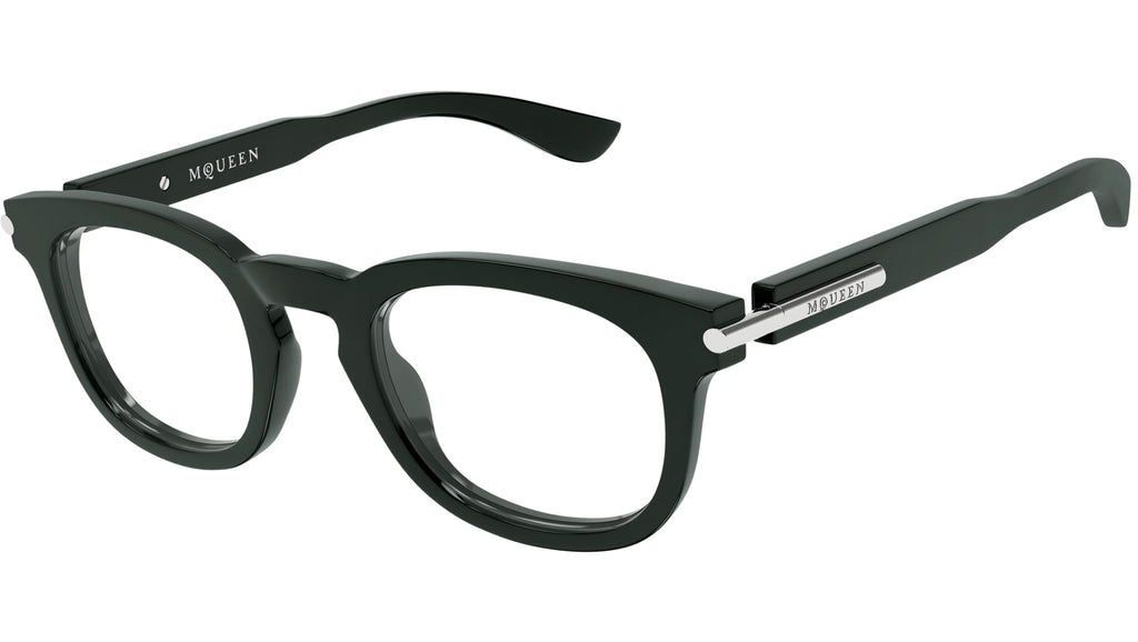 Occhiali da vista Alexander McQueen T-Bar modello AM0498O in acetato riciclato panthos codice colore 004 verde scuro tinta unita lucido con aste verde e lenti demo. Rivenditore autorizzato Alexander McQueen online. Gli occhiali vengono consegnati con custodia e accessori originali e sono coperti dalla garanzia ufficiale di 12 mesi del produttore.