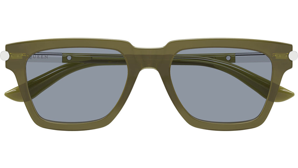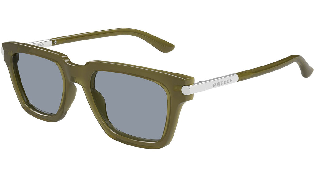 Occhiali da sole Alexander McQueen T-Bar modello AM0519S in acetato riciclato rettangolari codice colore 004 verde trasparente lucido con aste argento e lenti color azzurro tinta unita. Rivenditore autorizzato Alexander McQueen online. Gli occhiali vengono consegnati con custodia e accessori originali e sono coperti dalla garanzia ufficiale di 12 mesi del produttore.