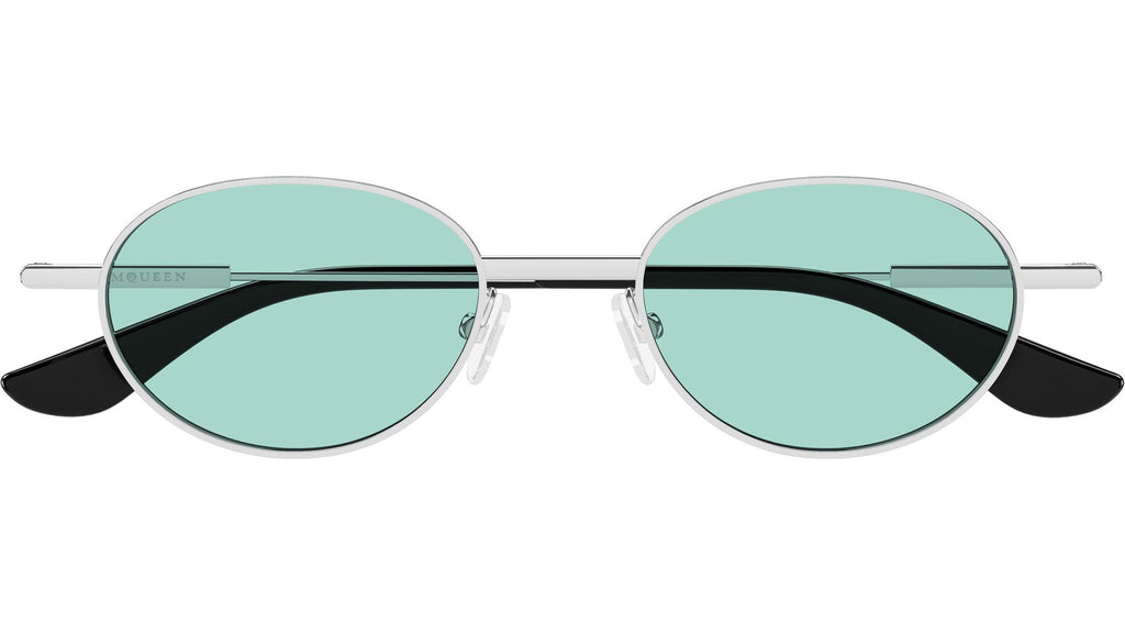 Occhiali da sole Alexander McQueen T-Bar modello AM0523S in metallo panthos codice colore 003 argento lucido con aste argento e lenti color verde turchese tinta unita. Rivenditore autorizzato Alexander McQueen online. Gli occhiali vengono consegnati con custodia e accessori originali e sono coperti dalla garanzia ufficiale di 12 mesi del produttore.