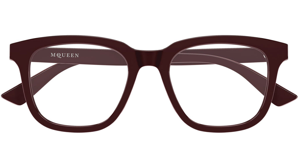 Occhiali da vista Alexander McQueen Logo modello AM0539O in acetato riciclato rettangolari codice colore 003 bordeaux intenso lucido con aste rosso e lenti demo. Rivenditore autorizzato Alexander McQueen online. Gli occhiali vengono consegnati con custodia e accessori originali e sono coperti dalla garanzia ufficiale di 12 mesi del produttore.