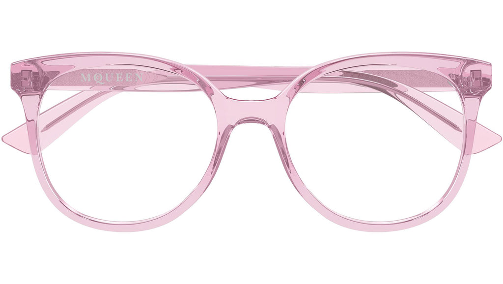 Occhiali da vista Alexander McQueen Logo modello AM0540O in acetato riciclato cat eye codice colore 005 rosa chiaro trasparente lucido con aste rosa e lenti demo. Rivenditore autorizzato Alexander McQueen online. Gli occhiali vengono consegnati con custodia e accessori originali e sono coperti dalla garanzia ufficiale di 12 mesi del produttore.