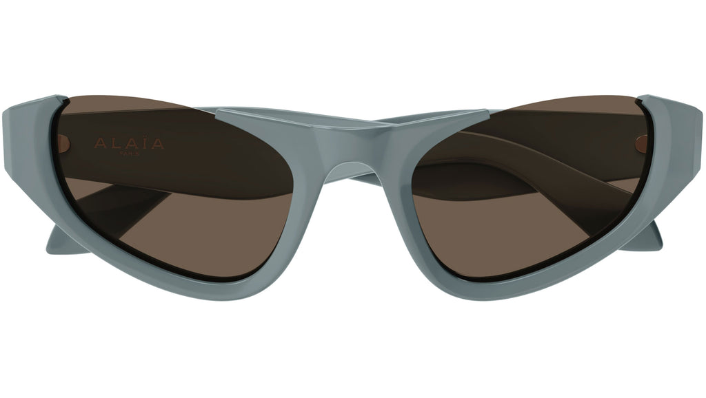 Occhiali da sole Azzedine Alaïa modello AA0076S linea Lettering Logo forma cat eye in acetato riciclato, codice colore 004 azzurro ghiaccio lucido con aste color azzurro e lenti color marrone tinta unita.