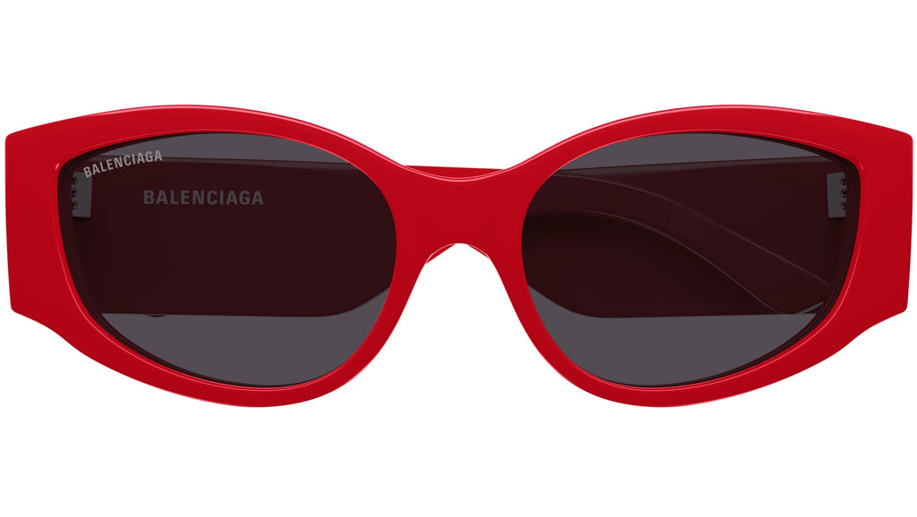 Occhiali da sole Balenciaga modello BB0258S linea Everyday codice colore 011 rosso tinta unita lucido in acetato riciclato forma cat eye con lenti color grigio tinta unita.