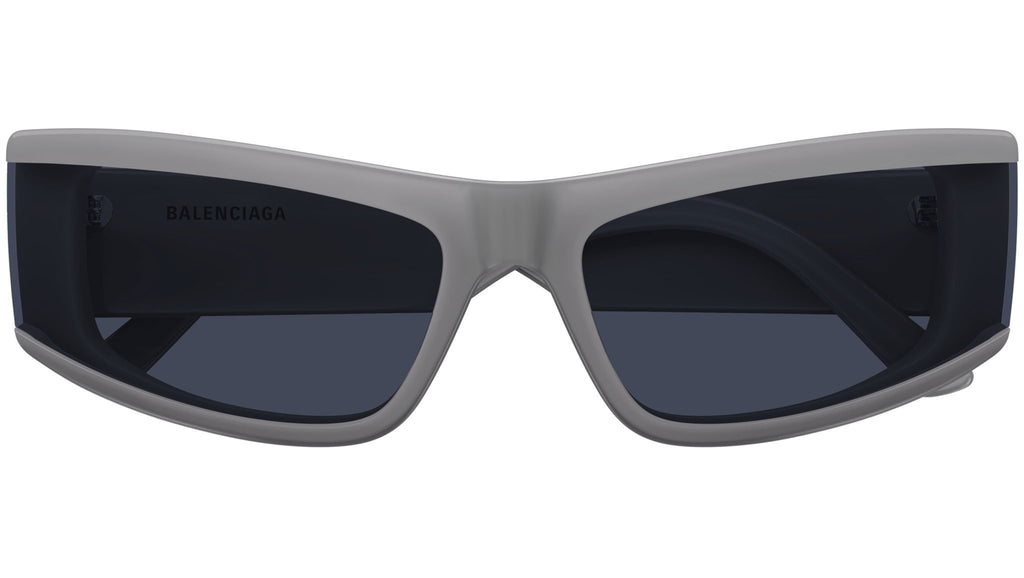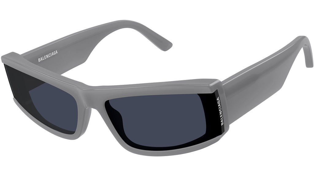 Occhiali da sole Balenciaga modello BB0301S linea Everyday codice colore 003 grigio tinta unita lucido in acetato riciclato forma cat eye con lenti color blu tinta unita.