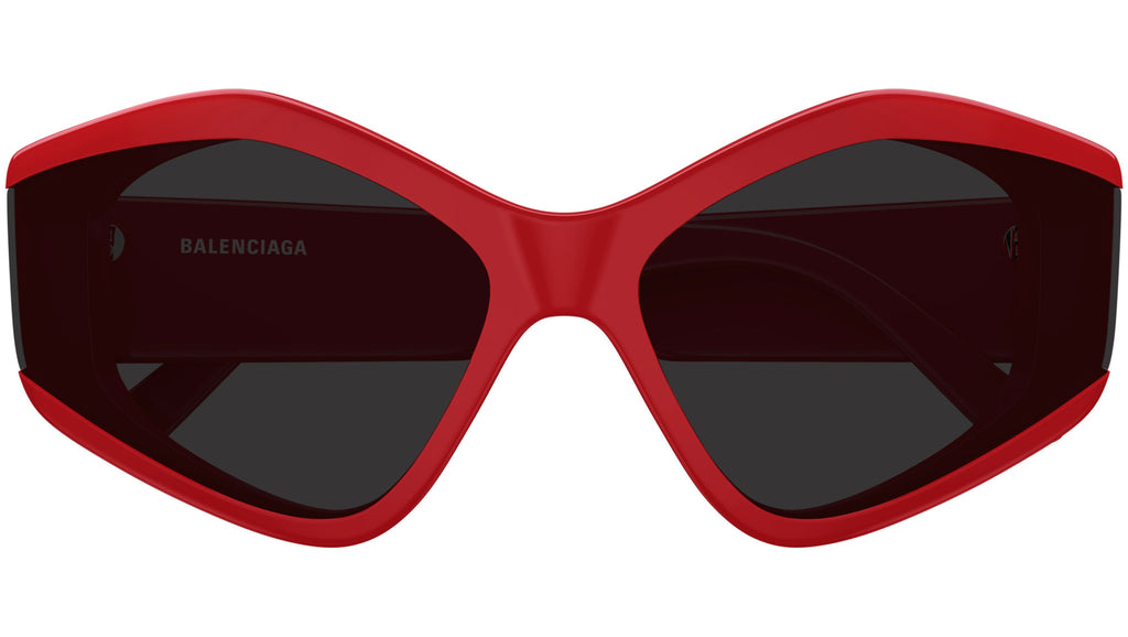 Occhiali da sole Balenciaga modello BB0302S linea Everyday codice colore 004 rosso tinta unita lucido in acetato riciclato forma geometric con lenti color grigio tinta unita.