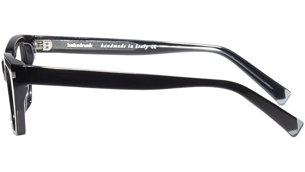 Montatura da vista Bobsdrunk Iris codice colore 01 in tonalità nero. Prodotti senza tempo e forme audaci convivono in questa originale collezione Eyewear. Le linee sono disegnate con maestria, per creare un effetto di audace leggerezza. Ogni paio di occhiali Bobsdrunk è caratterizzato da un dettaglio emblematico, mostrato sulla parte anteriore e sulla punta delle aste, che evidenzia il valore del marchio. Rappresenta in un iconico simbolo l'unione della lettera iniziale e finale di Bobsdrunk. La scelta accurata dei materiali, la selezione dell'artigianalità e una costante ricerca cromatica sono le prerogative di ogni creazione di Bobsdrunk.