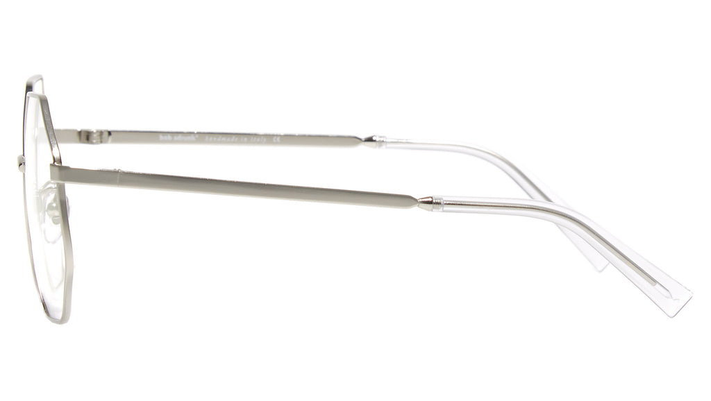 Il modello Bob Sdrunk da vista Isabella 103 con montatura color grigio argento e lenti demo antiriflesso. La meticolosa ricerca del design, delle forme, dei materiali e la cura di ogni singolo dettaglio, da vita a occhiali di alta qualità, originali e non convenzionali. Bob Sdrunk si propone di creare qualcosa che non è mai esistito; qualcosa che trova la sua vera sua identità nel futuro, ma trae origine da ispirazioni che provengono dal passato.