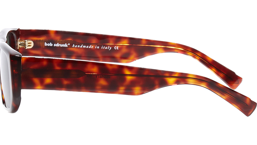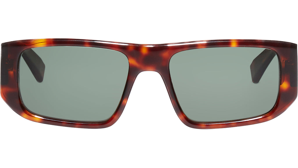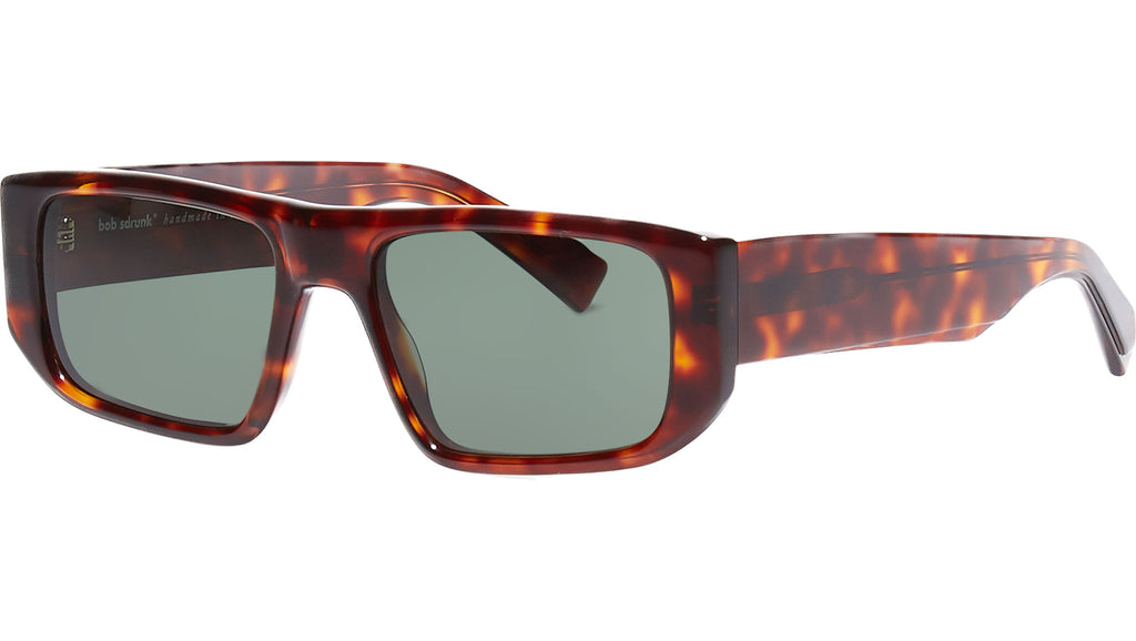 Acetate frame in tortoise with green solid lenses.
