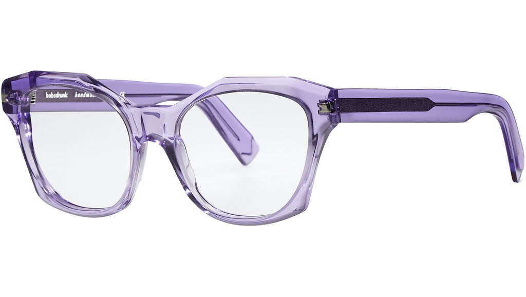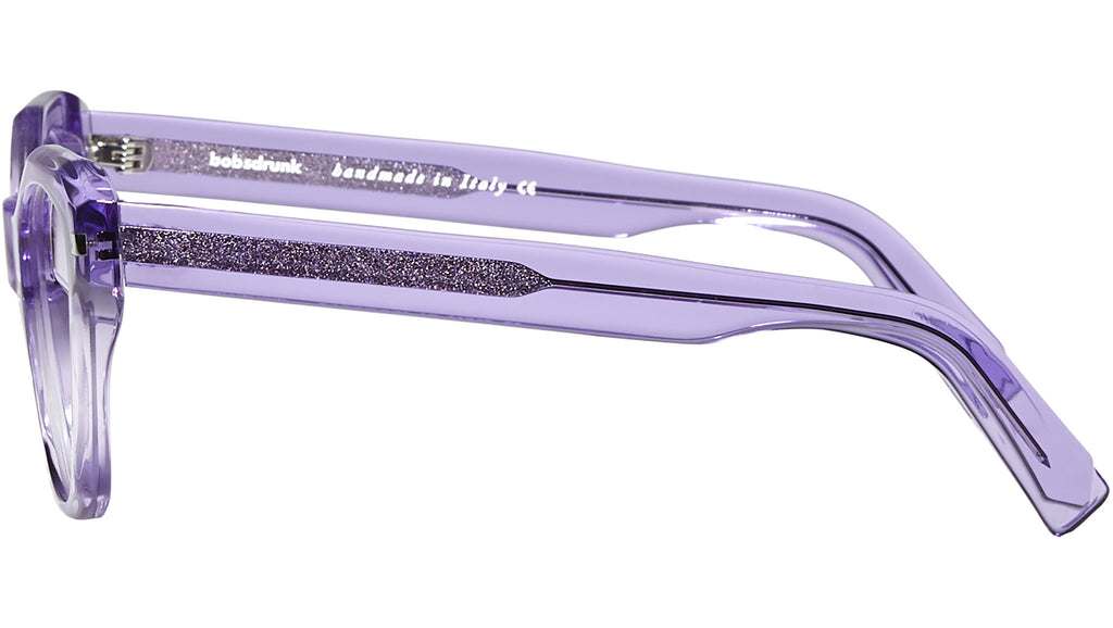 Montatura da vista Bobsdrunk Nina codice colore 181 in tonalità porpora digitale trasparente. Prodotti senza tempo e forme audaci convivono in questa originale collezione Eyewear. Le linee sono disegnate con maestria, per creare un effetto di audace leggerezza. Ogni paio di occhiali Bobsdrunk è caratterizzato da un dettaglio emblematico, mostrato sulla parte anteriore e sulla punta delle aste, che evidenzia il valore del marchio. Rappresenta in un iconico simbolo l'unione della lettera iniziale e finale di Bobsdrunk. La scelta accurata dei materiali, la selezione dell'artigianalità e una costante ricerca cromatica sono le prerogative di ogni creazione di Bobsdrunk.