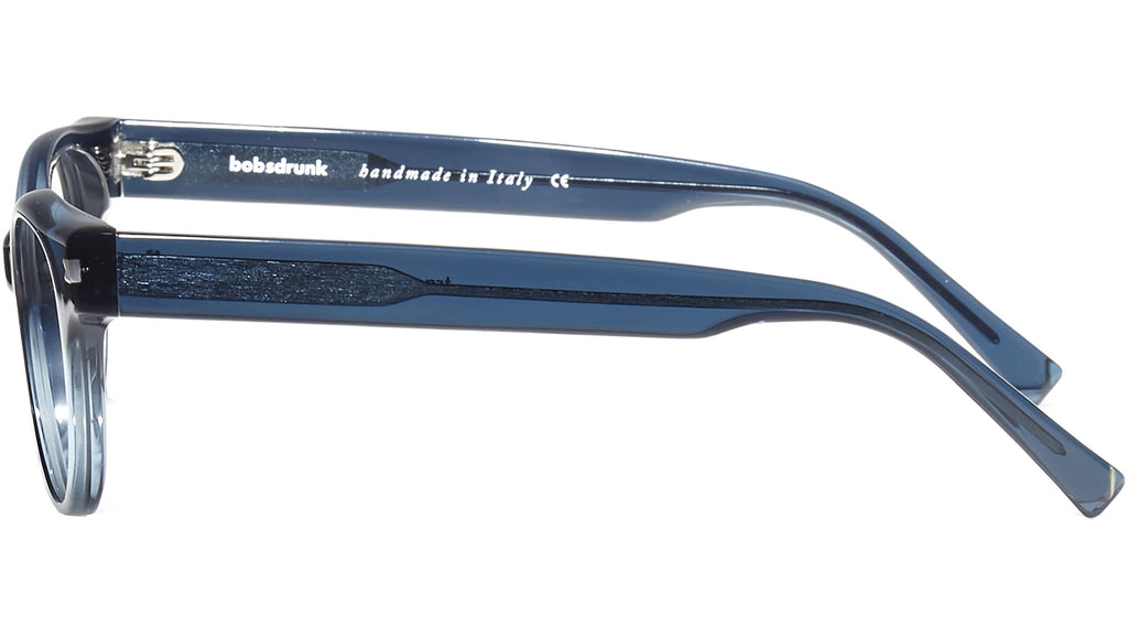 Montatura da vista Bobsdrunk Tracy codice colore 132 in tonalità blu inchiostro trasparente. Prodotti senza tempo e forme audaci convivono in questa originale collezione Eyewear. Le linee sono disegnate con maestria, per creare un effetto di audace leggerezza. Ogni paio di occhiali Bobsdrunk è caratterizzato da un dettaglio emblematico, mostrato sulla parte anteriore e sulla punta delle aste, che evidenzia il valore del marchio. Rappresenta in un iconico simbolo l'unione della lettera iniziale e finale di Bobsdrunk. La scelta accurata dei materiali, la selezione dell'artigianalità e una costante ricerca cromatica sono le prerogative di ogni creazione di Bobsdrunk.