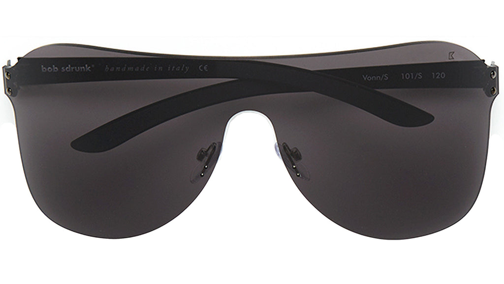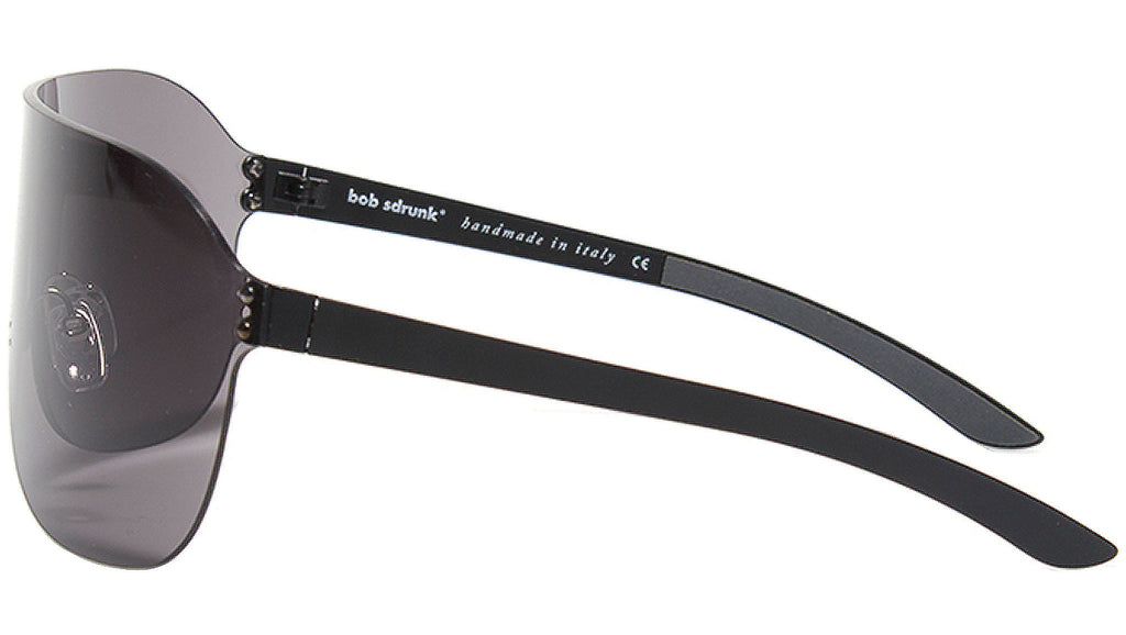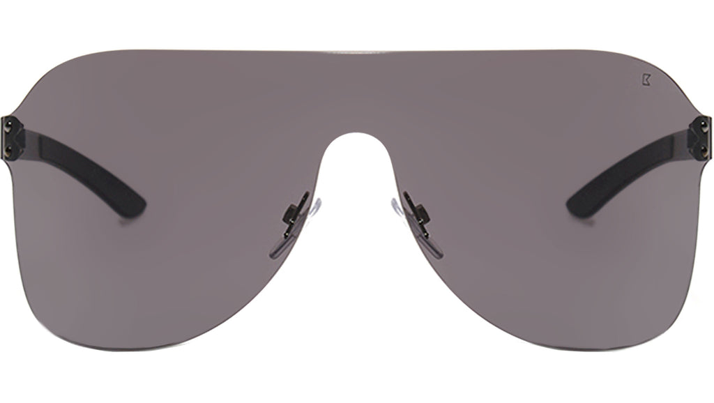 A shield-shaped sunglasses frame in black. black lenses.