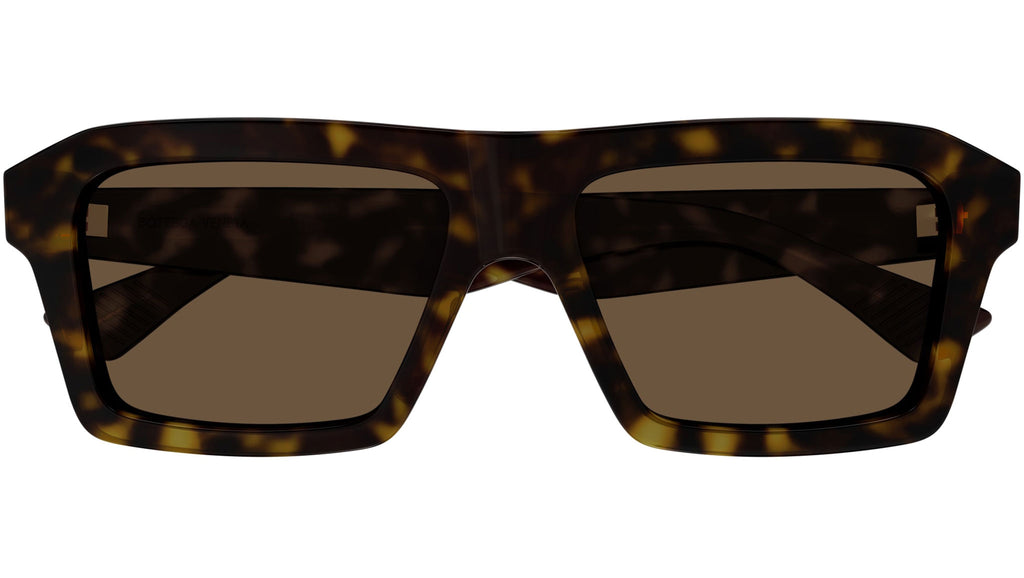 Occhiali da sole Bottega Veneta linea New Classic modello BV1213S variante colore 002 tartaruga scuro lucido con lenti color marrone tinta unita.