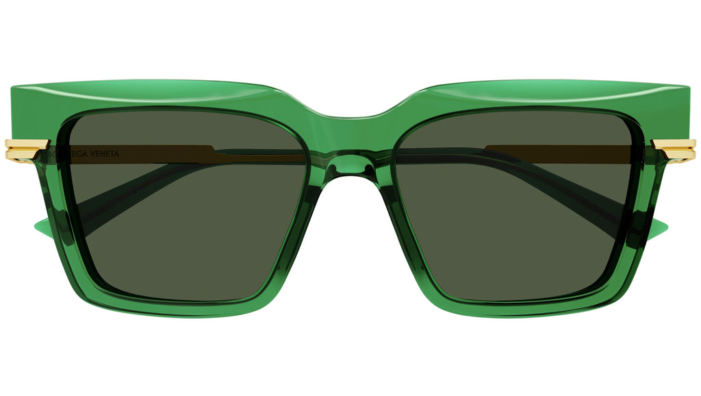 Occhiali da sole Bottega Veneta linea Minimalist modello BV1242S variante colore 003 verde trasparente lucido con lenti color verde scuro tinta unita.