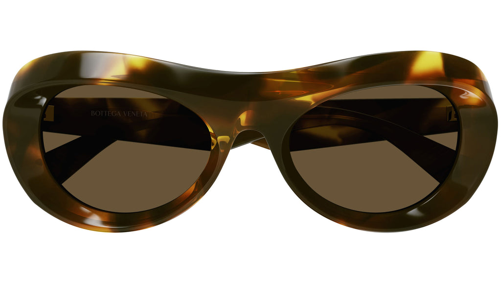 Occhiali da sole Bottega Veneta modello BV1284S linea New Classic codice colore 002 avana maculato macro quadrato lucido in acetato riciclato forma panthos con lenti color marrone tinta unita.