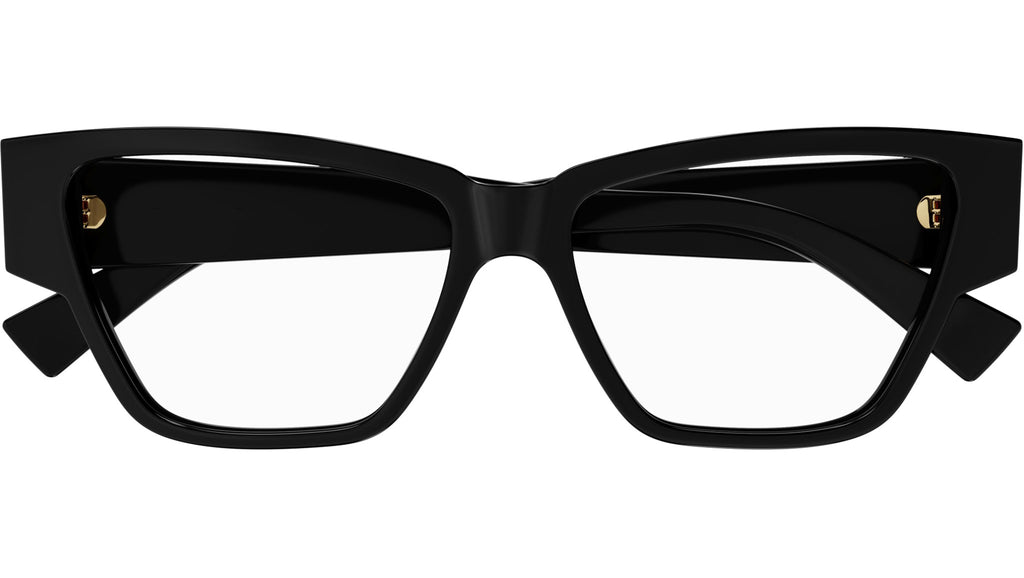 Occhiali da vista Bottega Veneta modello BV1288O linea New Classic codice colore 001 nero lucido tinta unita in acetato riciclato forma cat eye con aste color nero.