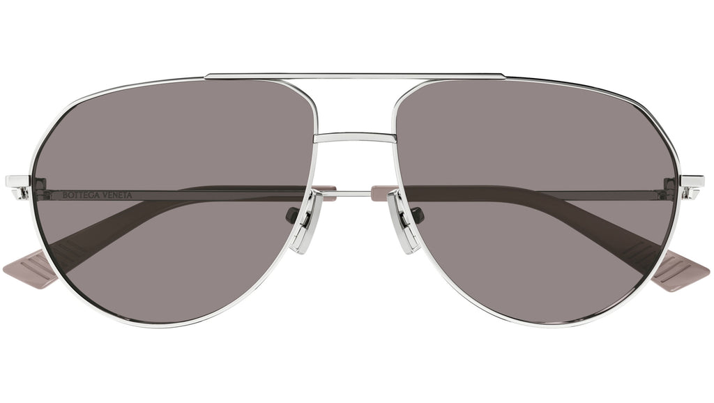 Occhiali da sole Bottega Veneta modello BV1302S linea Minimalist codice colore 004 argento lucido in metallo forma aviator con lenti color viola grigio solido.