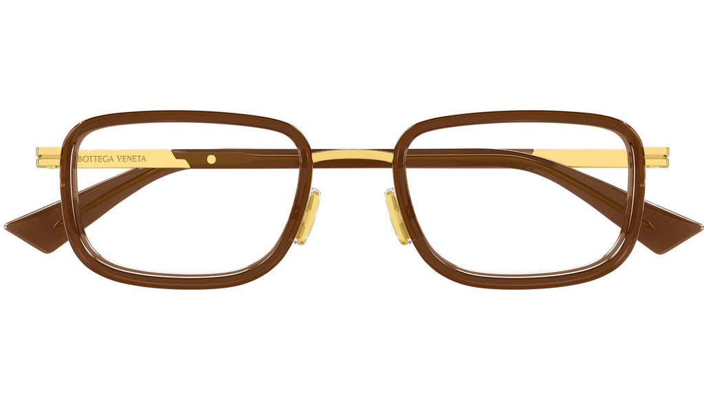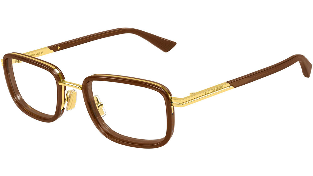 Occhiali da vista Bottega Veneta BV1464O 007 uomo con montatura rettangolare in metallo oro lucido con cerchi marrone trasparente lucidi e lenti demo. Linea: Ribbon. Codice modello: BV1464O. Codice colore: 007. Made in Italy. Rivenditore autorizzato Bottega Veneta online. Gli occhiali vengono consegnati con custodia e accessori originali e sono coperti dalla garanzia ufficiale di 12 mesi del produttore.