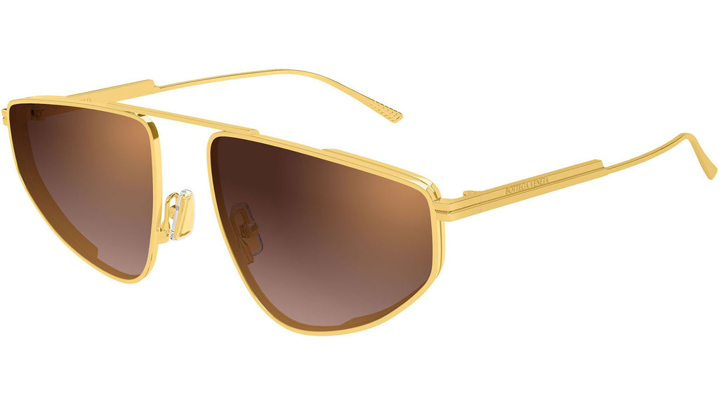 Occhiali da sole Bottega Veneta BV1466S 004 donna con montatura aviatore in metallo oro lucido e lenti marrone caldo doppio sfumato a rosa antico + flash elettrico sul retro. Linea: Ribbon. Codice modello: BV1466S. Codice colore: 004. Made in Italy. Rivenditore autorizzato Bottega Veneta online. Gli occhiali vengono consegnati con custodia e accessori originali e sono coperti dalla garanzia ufficiale di 12 mesi del produttore.
